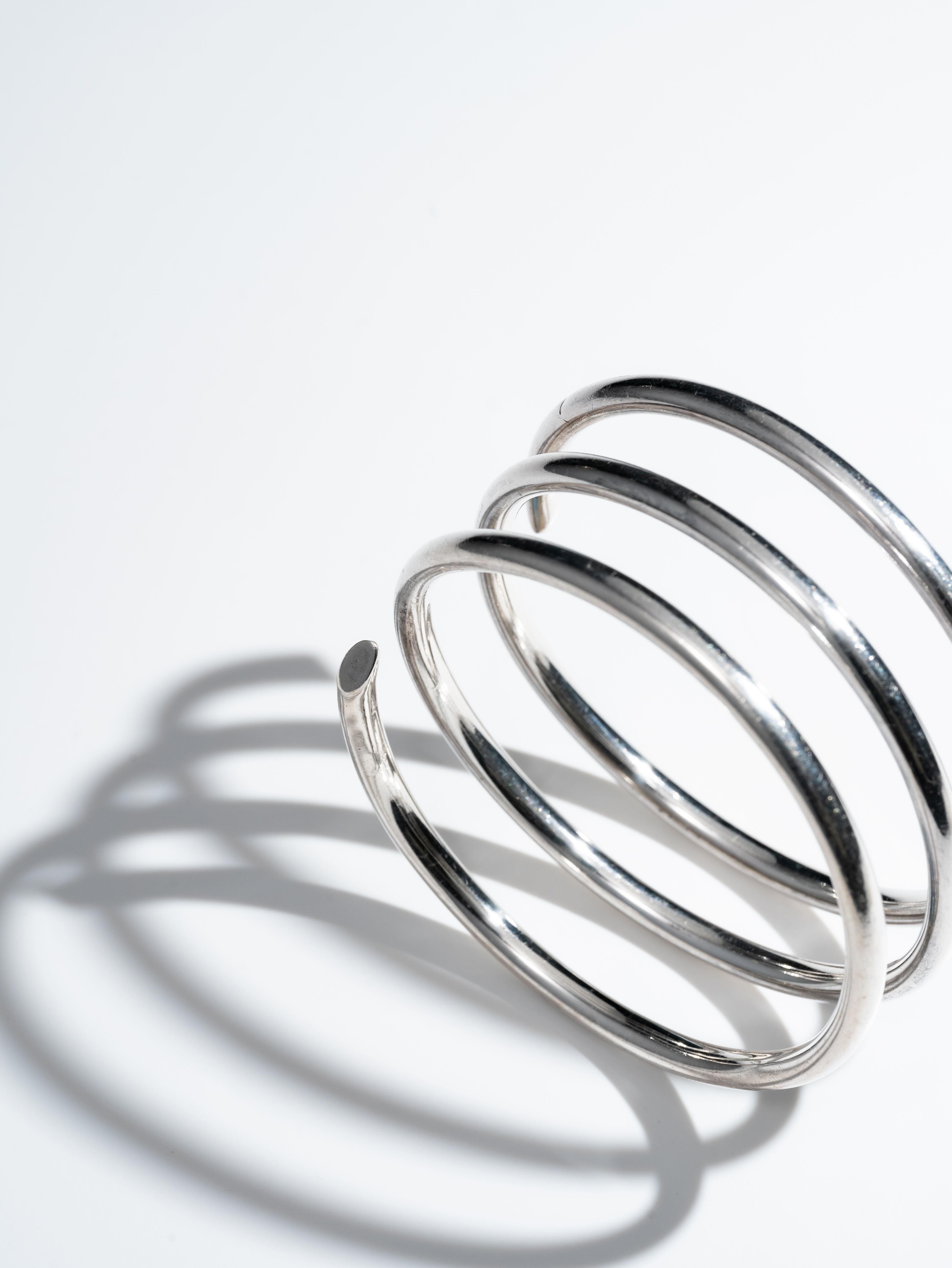 コイル状のデザインを有する個性的なシルバー製バングル。